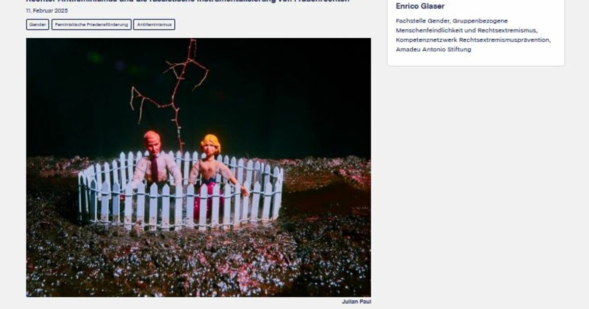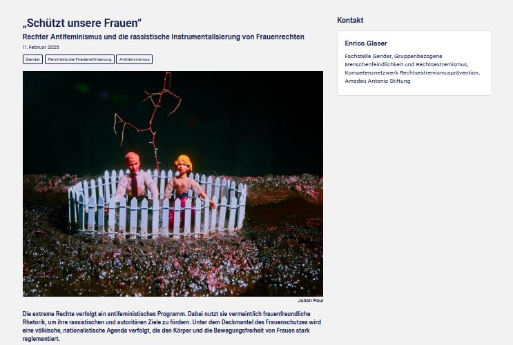 Der Artikel zeigt, wie die extreme Rechte Frauenrechte instrumentalisiert, um sowohl rassistische als auch antifeministische Politiken zu legitimieren. Er führt in spezifische Narrative ein, die an der Schnittstelle von Rechtsextremismus und Antifeminismus liegen. Es geht etwa um die angebliche Schuld des Feminismus am Rückgang der Geburtenrate und an der Zerstörung der Familie, die wiederum im sogenannten "Volkstod" münden würden. Das Familienbild, mit dem sie diese vermeintliche Bedrohung bekämpfen wollen, ist weiß-deutsch, kinderreich und heterosexuell.