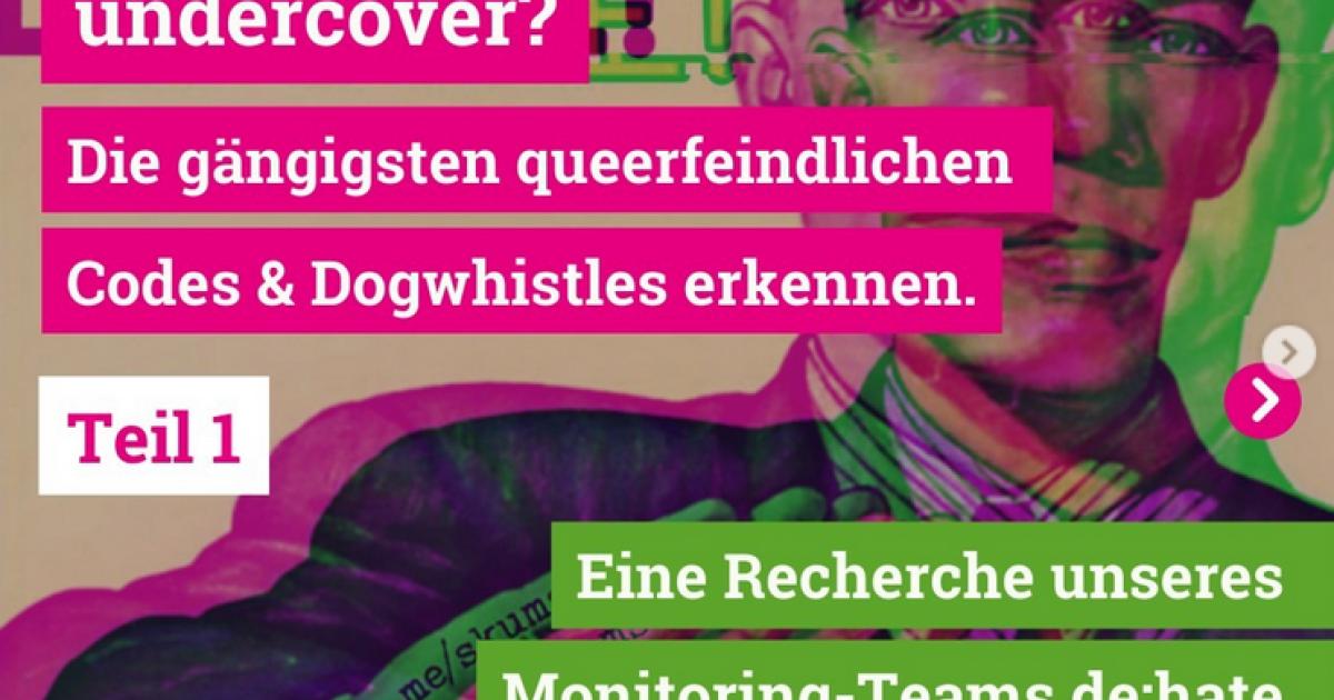 In der zweiteiligen Post-Serie auf Instagram (Teil 2) werden gängige queerfeindliche Codes und sogenannte "Dogwhistles" erklärt. Die Begriffe scheinen oft zunächst harmlos und sind nur von der Anhänger*innenschaft bestimmter Verschwörungserzählungen und rechtsextremer Ideologien erkennbar. Daher ist es umso wichtiger, diese Begriffe und ihre Zusammenhänge zu menschenfeindlichen Narrativen zu kennen, um die Aussagen entkräften zu können. Der Post erklärt die Begriffe "Genderwahn/Gendergaga", "Fetisch", "Frühsexualisierung", "Kulturmarxismus" / "68".